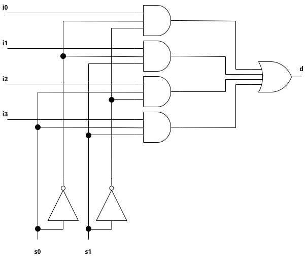 Quatro entradas de dados i3, i2, i1 e i0, duas entradas de seleção s1 e s0, e uma saída de dados d.